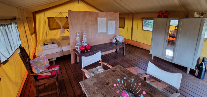 Je komt logeren bij Sandra en Santi op Simply Canvas Farm in Frankrijk. Op het randje van de Dordogne, vlakbij Bergerac, is de plek omgeven door zonnebloemvelden en wijngaarden. Het eten is heerlijk, de natuur prachtig en je slaapt in fijne safaritenten ingericht als een huis, of één van de drie vakantiehuizen.